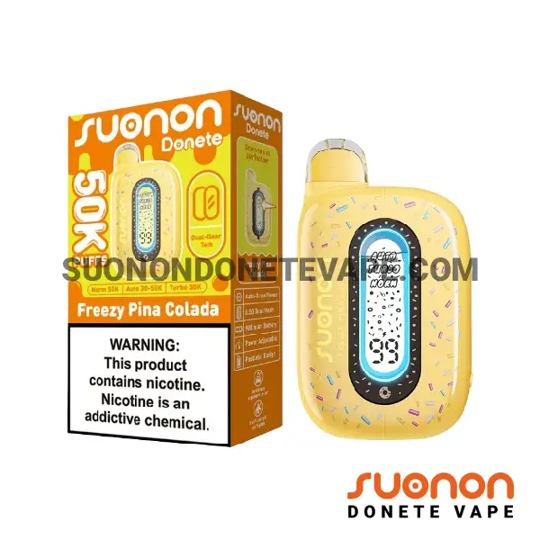 Freezy Pina Colada Suonon Donete 50k Puffs is perfect for vapers seeking tropical flavors, smooth nicotine satisfaction, and extended, hassle-free vaping sessions.